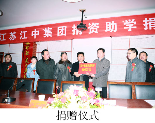 2011年12月26日,江中集团捐资助学捐款仪式在如皋市吴窑镇小学报告厅举行,这次我集团捐资600万元,用于吴窑小学新建工程建设。该工程的实施将进一步改善吴窑镇办学条件,使该镇教育设施更加完善,教育布局得到进一步优化。参加捐赠仪式领导有:如皋市副市长缪爱诚;如皋市政协副主席张元健;如皋市慈善基金会副理事长秦玉林;吴窑镇党委书记、镇长赵宏祥;吴窑镇党委副书记、副镇长郭建;集团董事局主席沈良兵;集团有限公司总裁沈岳等。