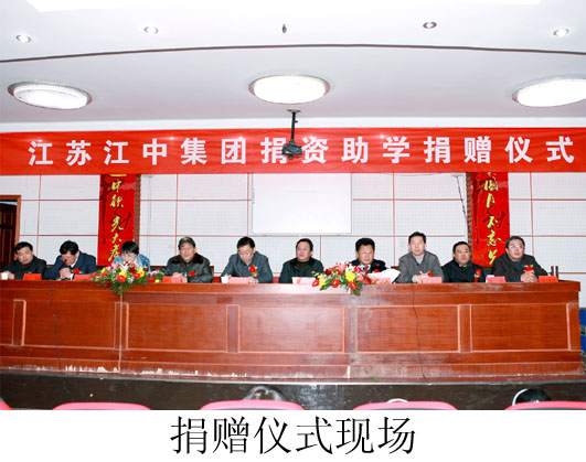 2011年12月26日,江中集团捐资助学捐款仪式在如皋市吴窑镇小学报告厅举行,这次我集团捐资600万元,用于吴窑小学新建工程建设。该工程的实施将进一步改善吴窑镇办学条件,使该镇教育设施更加完善,教育布局得到进一步优化。参加捐赠仪式领导有:如皋市副市长缪爱诚;如皋市政协副主席张元健;如皋市慈善基金会副理事长秦玉林;吴窑镇党委书记、镇长赵宏祥;吴窑镇党委副书记、副镇长郭建;集团董事局主席沈良兵;集团有限公司总裁沈岳等。