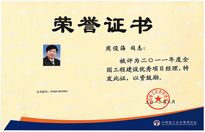 2012年5月16日,中施企协在成都隆重召开了第27次年会暨施工装备展览洽商会,我集团荣获全国优秀施工企业,集团副董事长、东北分公司总经理马华被评为高级职业经理人,集团董事、苏州分公司总经理周俊海被评为全国优秀项目经理。