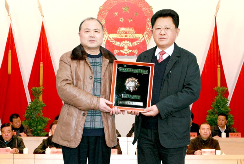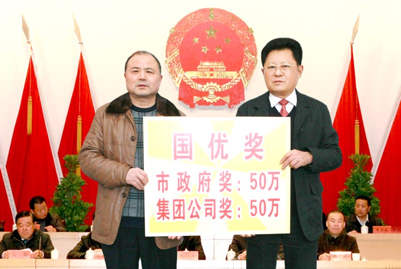 集团监事会主席、徐州公司总经理沈忠星向集团董事局主席、党委书记沈良兵呈送国优奖牌