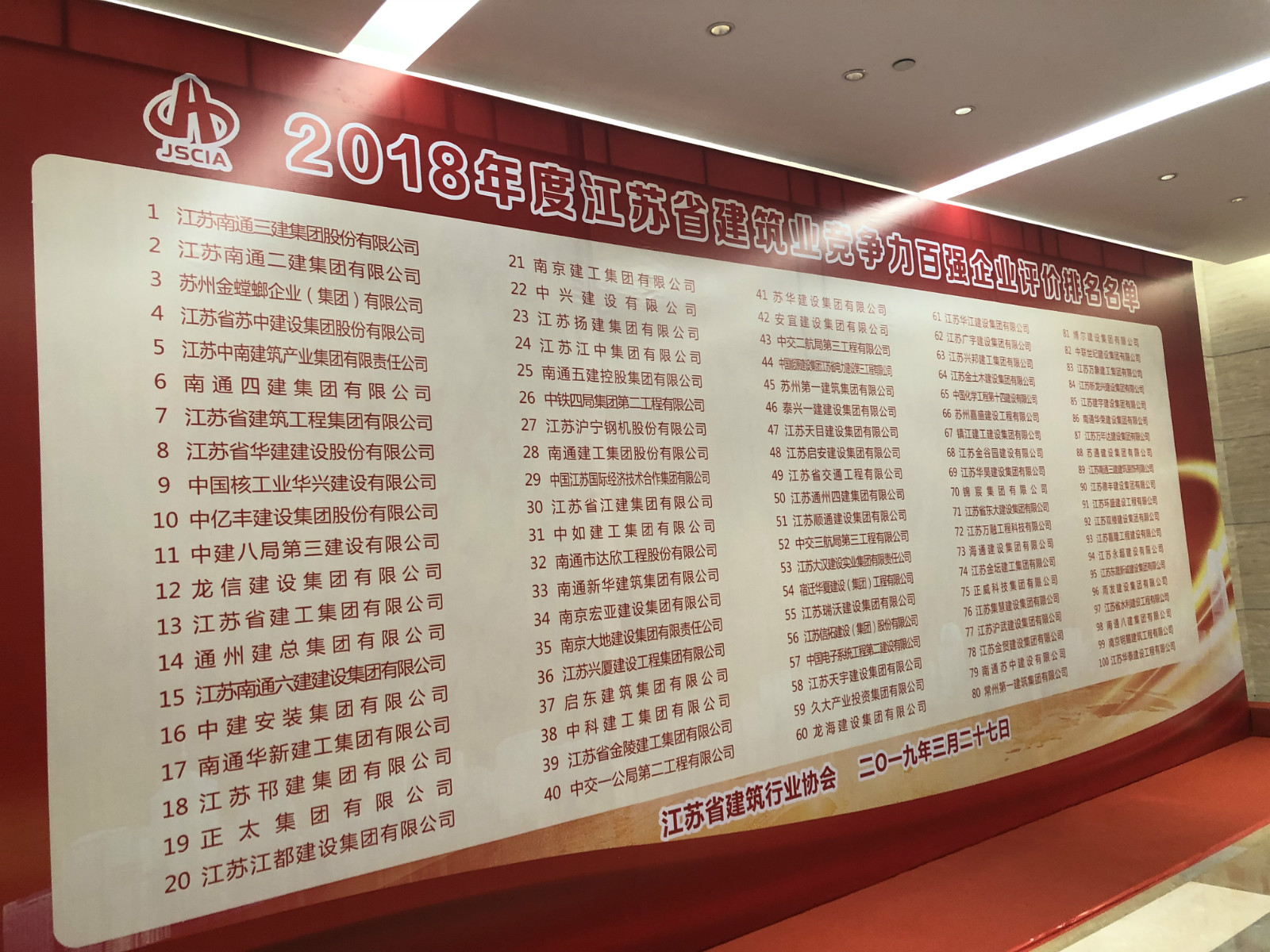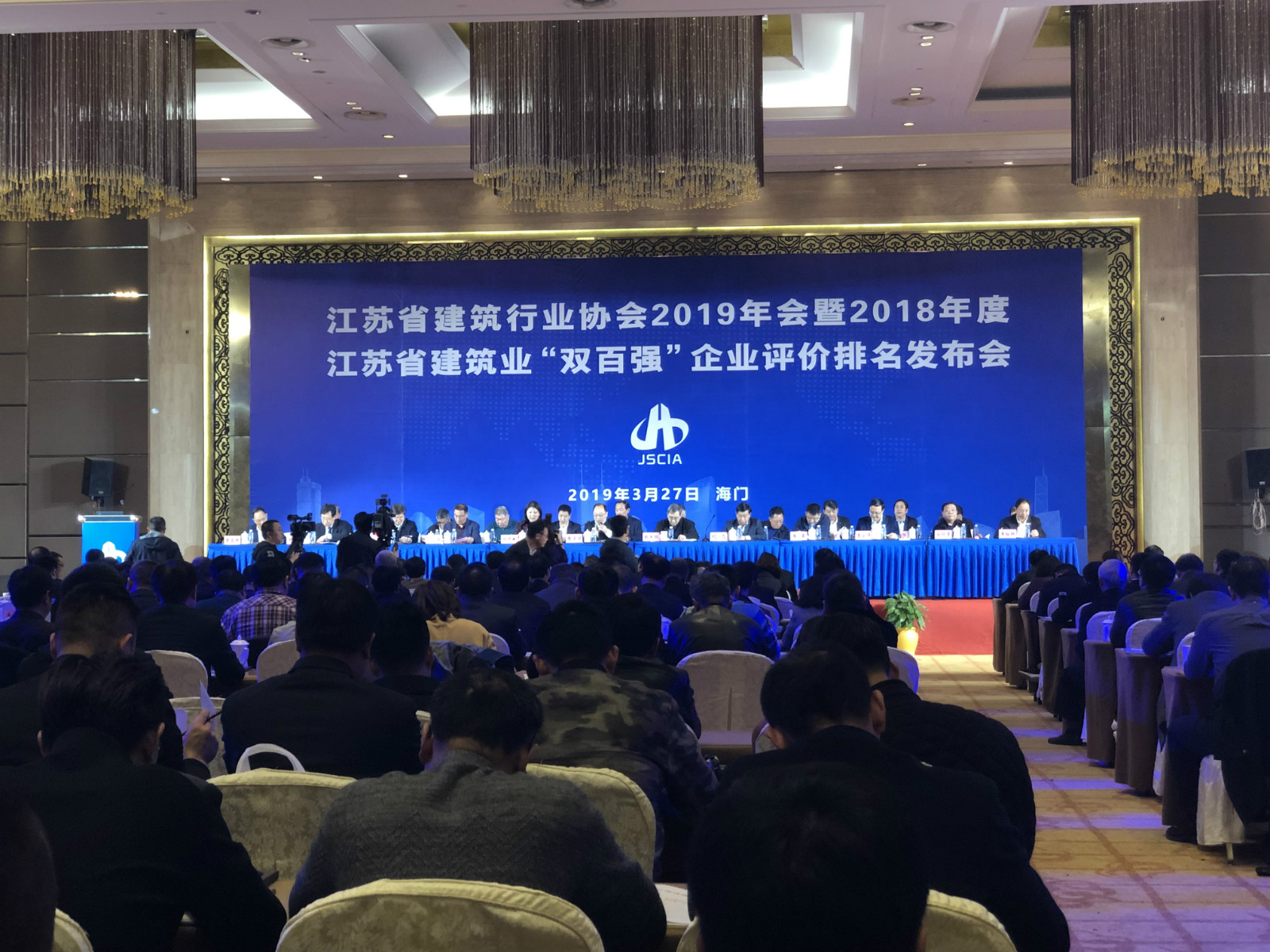 3月26日,江苏省建筑行业协会2019年会暨2018年度江苏省建筑业“双百强”企业评价排名发布会在江苏海门隆重举行。江苏省住房和城乡建设厅、南通市住房和城乡建设局、海门市有关领导以及协会领导、会员企业代表600多人参加会议。