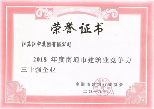 南通市建筑业竞争力三十强企业按竞争力指数总分值排名。竞争力指数评价共分经营规模、资产规模、盈利能力、上缴税金、员工构成、科技进步、管理水平、精神文明等8项分类指标和全年营业收入合计、建筑业总产值、在境外完成营业额等细化指标。江苏江中集团获评此奖项充分说明了集团的企业综合实力和2018年度取得的骄人经营成绩。